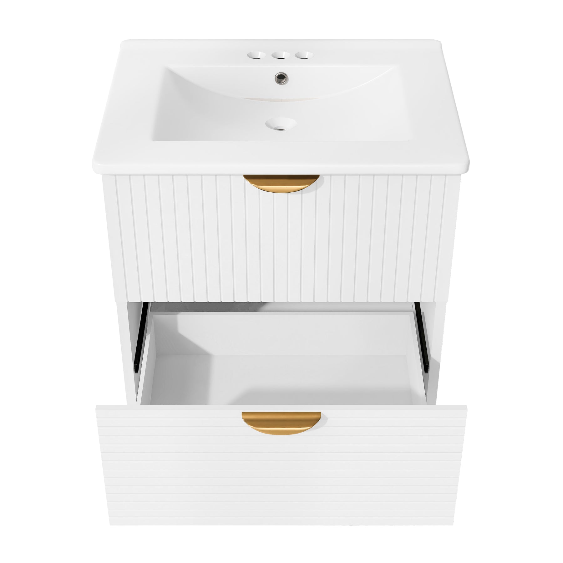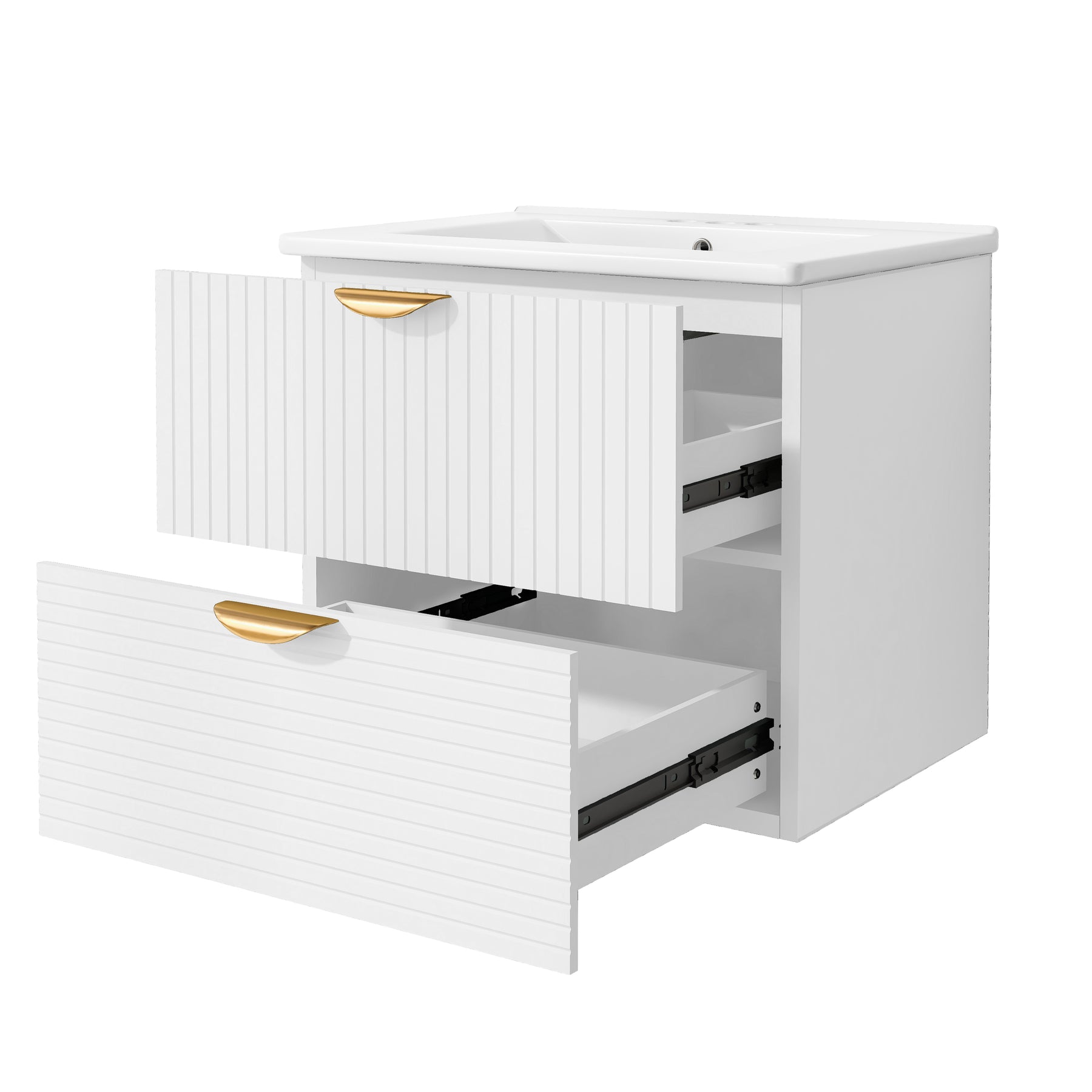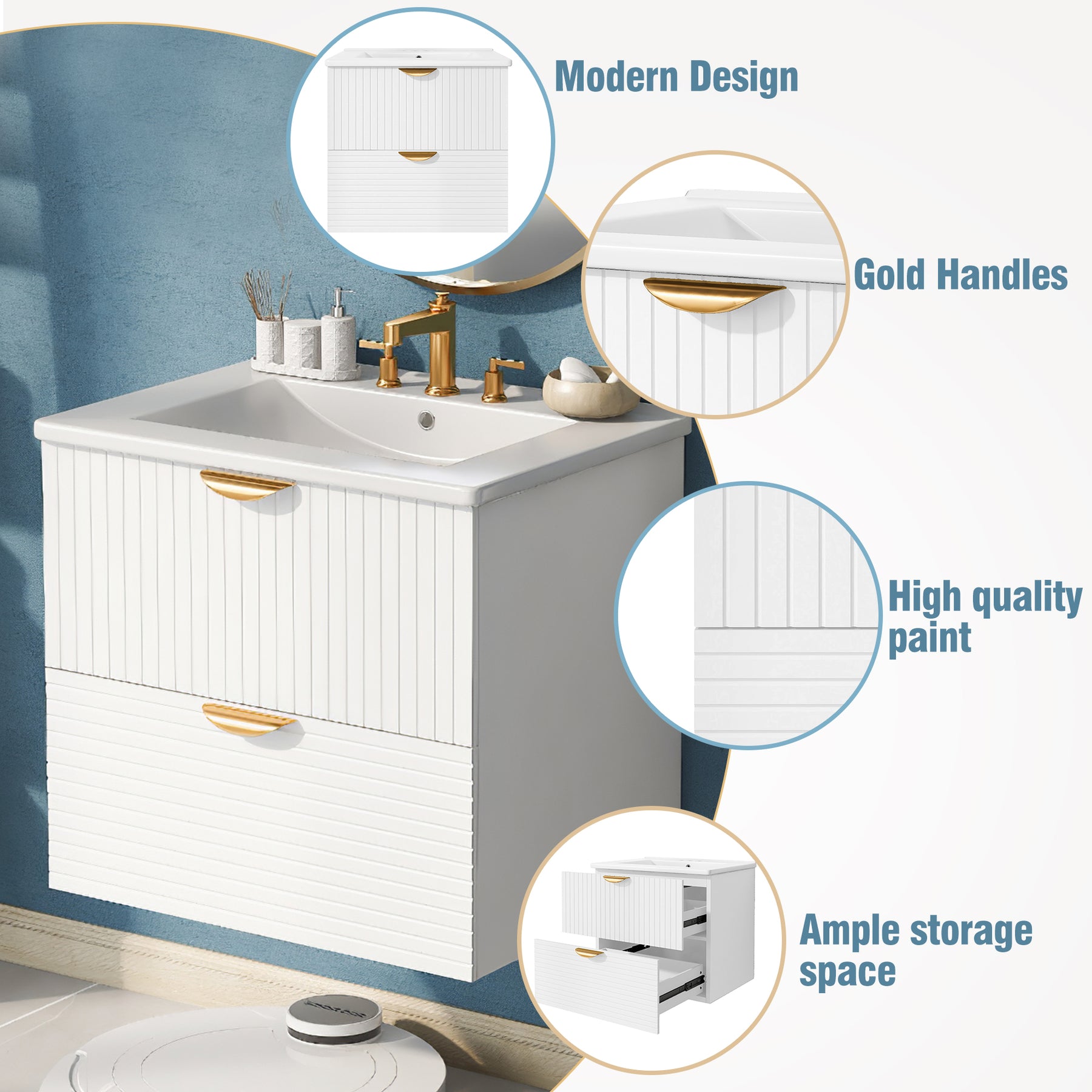 Upgrade your bathroom with this modern 24-inch wall-mounted vanity, designed for compact spaces and stylish organization. Featuring two spacious drawers with elegant gold handles, this white MDF cabinet offers durable storage for toiletries and towels.
