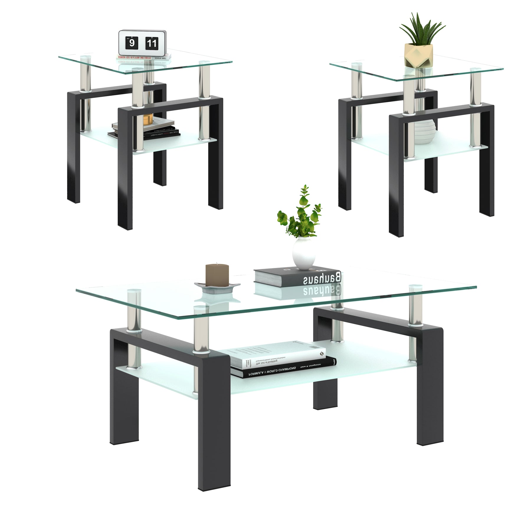 Enhance your living space with this modern set of 2 tempered glass coffee tables. Featuring square tabletops with a transparent upper layer and frosted lower shelf, these tables combine style and function perfectly. The sturdy metal legs and thick tempered glass support up to 150 lbs each, offering a durable surface for your essentials.