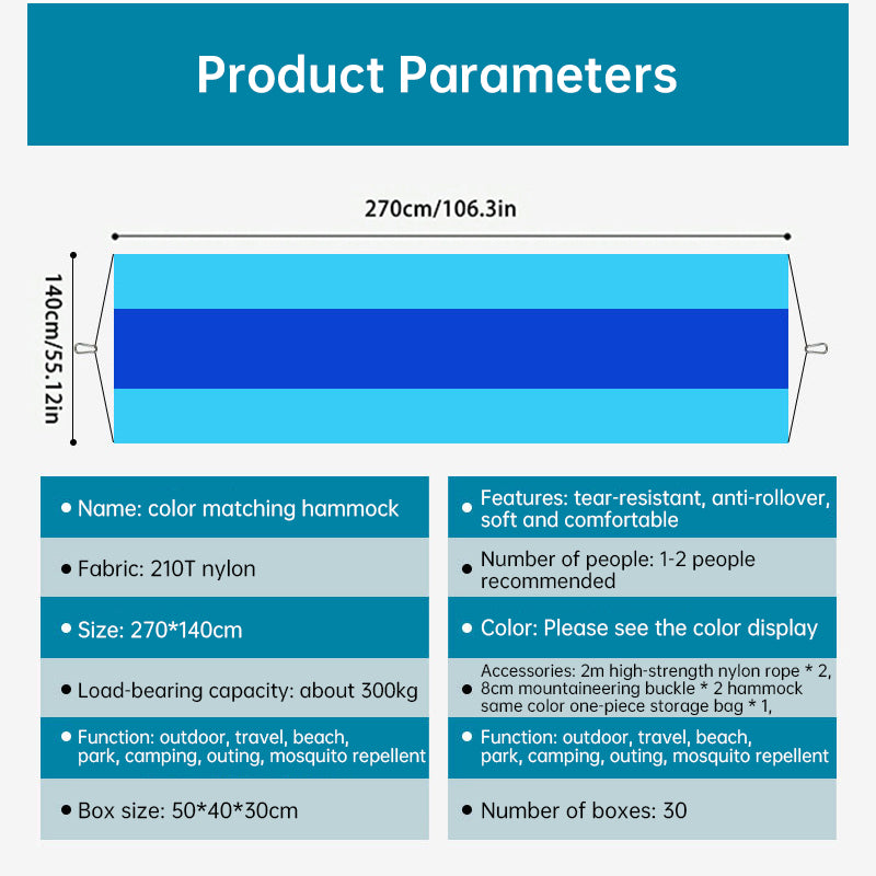 With a generous 270×140cm size and a 300kg weight capacity, it comfortably fits 1–2 people. Designed for tear resistance, anti-rollover stability, and mosquito protection, this hammock ensures a safe and cozy experience in the great outdoors.